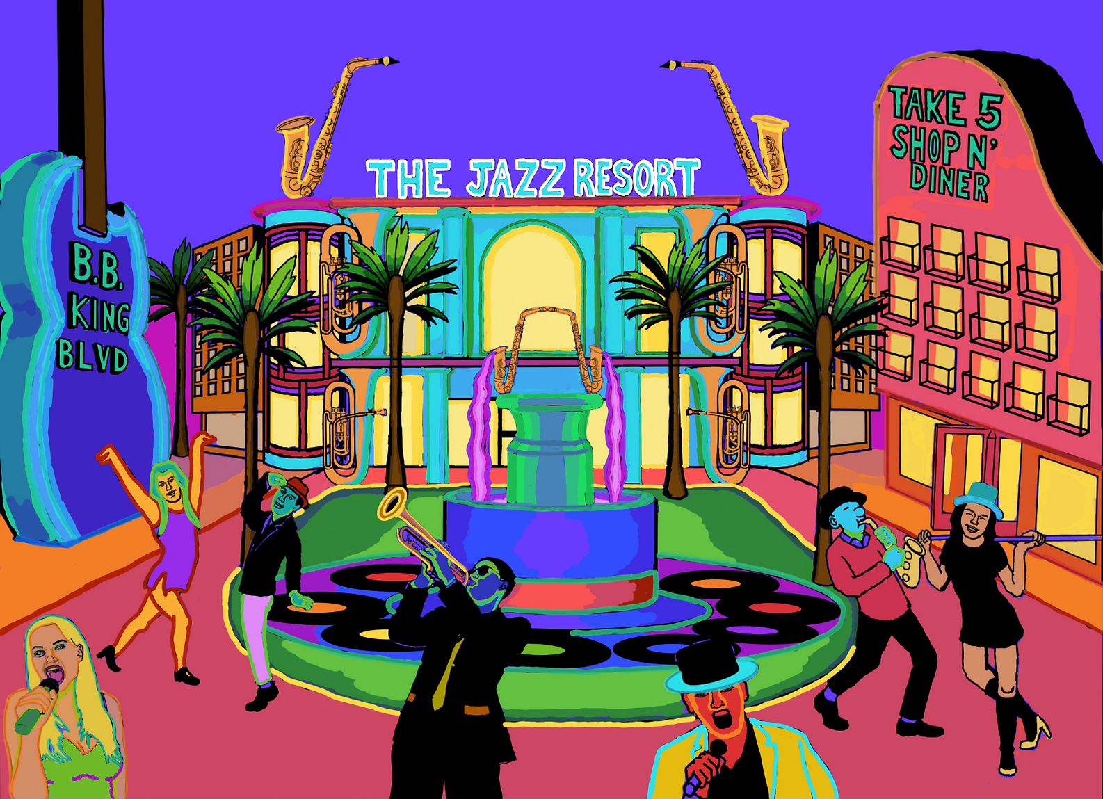 I was instructed to draw an imaginary place and apply different types of color. I did The Jazz Resort because I admire to jazz music. I would listen to it while working on my projects. I want my illustration to be seen as a hotel resort and spa.